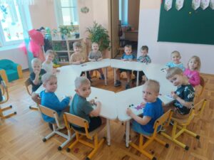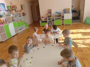 Дети с радостью принялись за выполнение задания. Пластилин грели, отрывали небольшие кусочки, размазывали по картону.